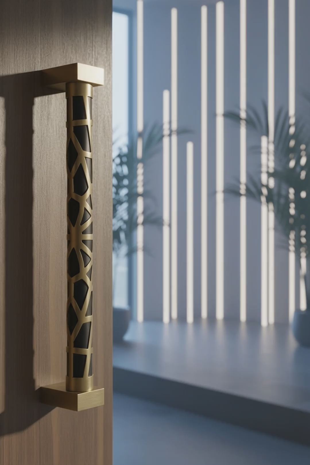 This exquisite door handle, inspired by the radiant sun, combines elegance and modern design seamlessly. Crafted from high-quality metal with a polished gold finish, the handle features an intricate sunburst pattern that allows light to subtly pass through, creating a striking visual effect. Its cylindrical shape is both ergonomic and stylish, making it a perfect statement piece for any door, whether in a contemporary home or a luxury office. The handle's smooth texture and robust construction ensure durability while adding a touch of warmth and sophistication to your space.