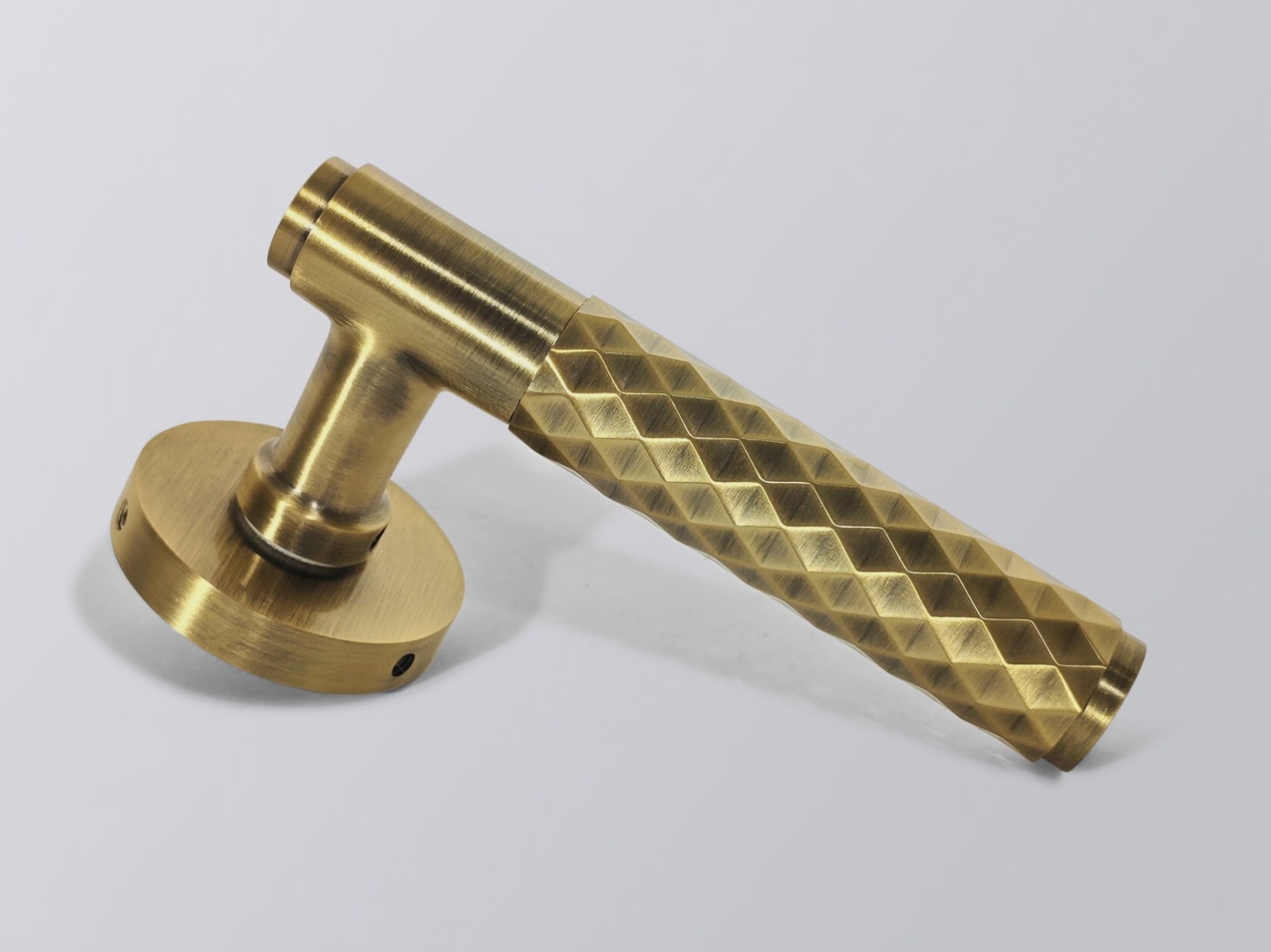 With a striking geometric motif and a refined cylindrical profile, this handle brings together tactile comfort and contemporary sophistication. The diamond-patterned grip ensures a secure hold while adding a dynamic visual texture, making it a distinctive accent for modern interiors. Precision-machined from solid metal, the handle’s clean lines and robust construction reflect a commitment to both durability and design excellence. Its round rose base offers seamless integration with a variety of door types, balancing aesthetic appeal with everyday functionality. Ideal for those seeking a statement piece that combines architectural character with ergonomic ease, this handle elevates any space with its harmonious blend of form and function.